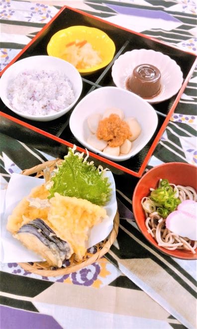天ぷら、鮭といくらのちらし寿司、茶碗蒸し、きのこご飯など、目でも楽しめる彩り豊かなお食事にみなさん喜ばれていました。