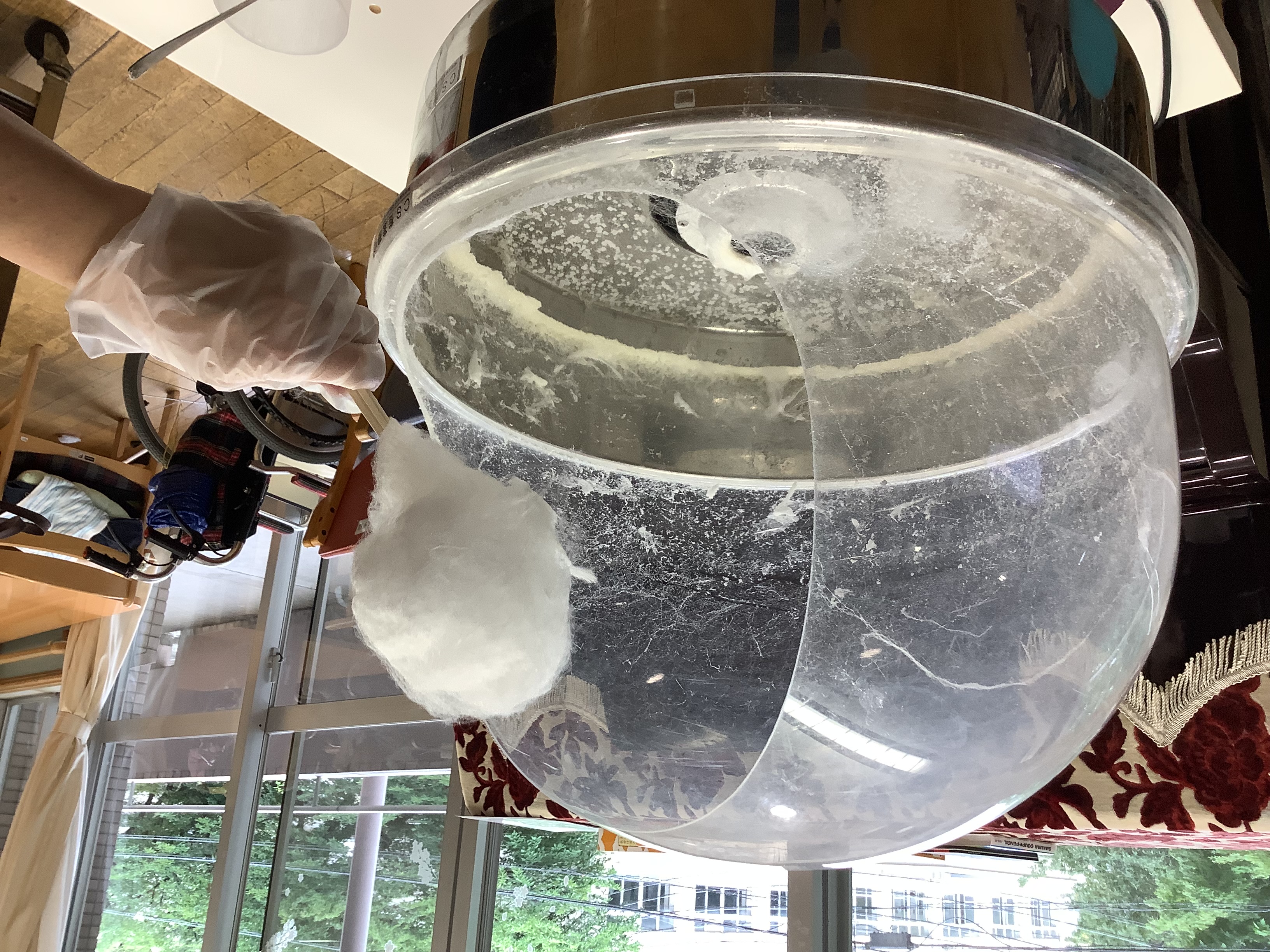 祇園祭巡行をひかえた令和5年7月14日に、少し早いお祭り気分を味わっていただきたく、わた菓子機をフロアに設置してできたてのわた菓子を召し上がっていただきました。